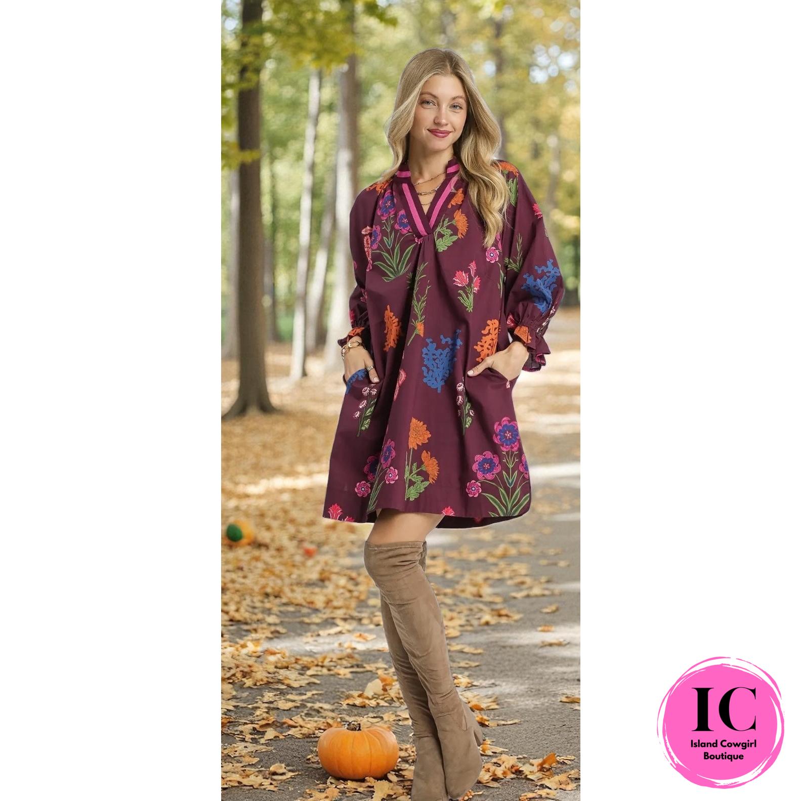 This dress is giving major fall vibes with its floral print in warm shades of red, orange, and purple! The relaxed silhouette keeps it comfy. Finished with a split V-neckline and breezy long sleeves, it’s perfect for everything from pumpkin patches to brunch dates. Pair it with boots for an effortlessly chic look!