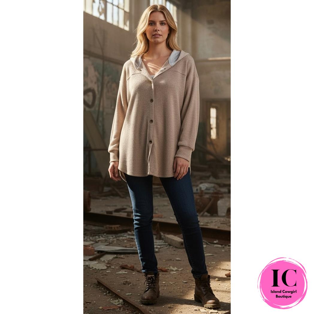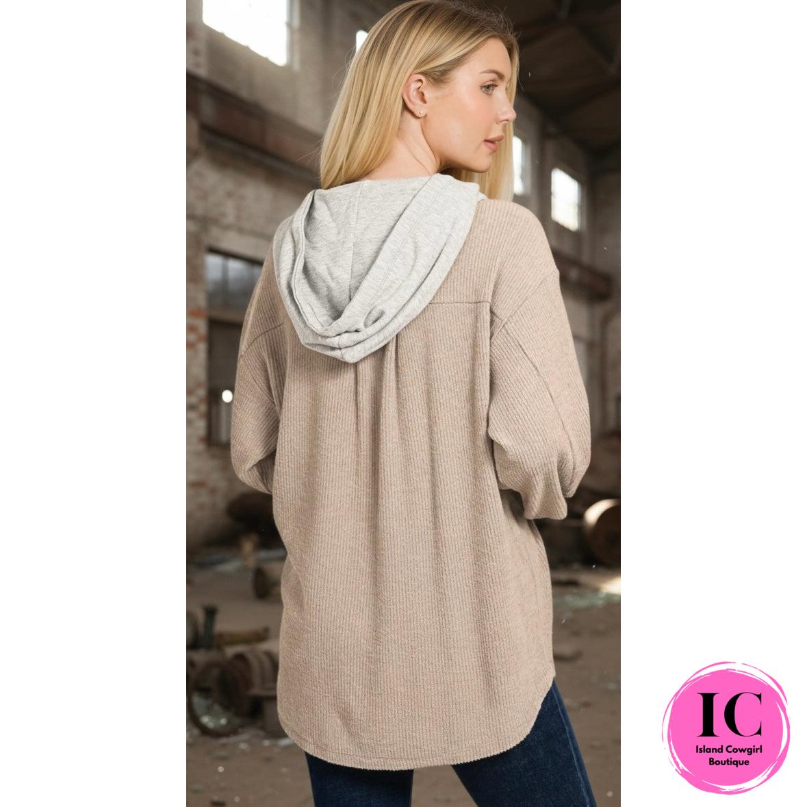 - Brushed ribbed hooded button-down shacket