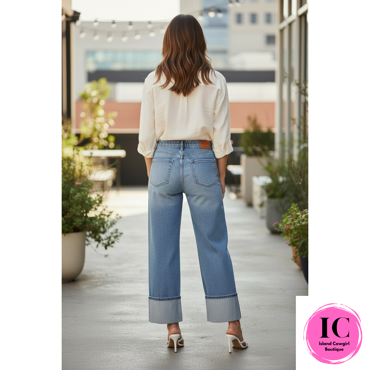 These wide-leg jeans are denim goals! The dramatic cuffed hem gives them that trendy twist while still keeping it classic. High-waisted and super flattering, they’re perfect for dressing up with heels or going casual with sneakers. Trust us—your closet needs these!